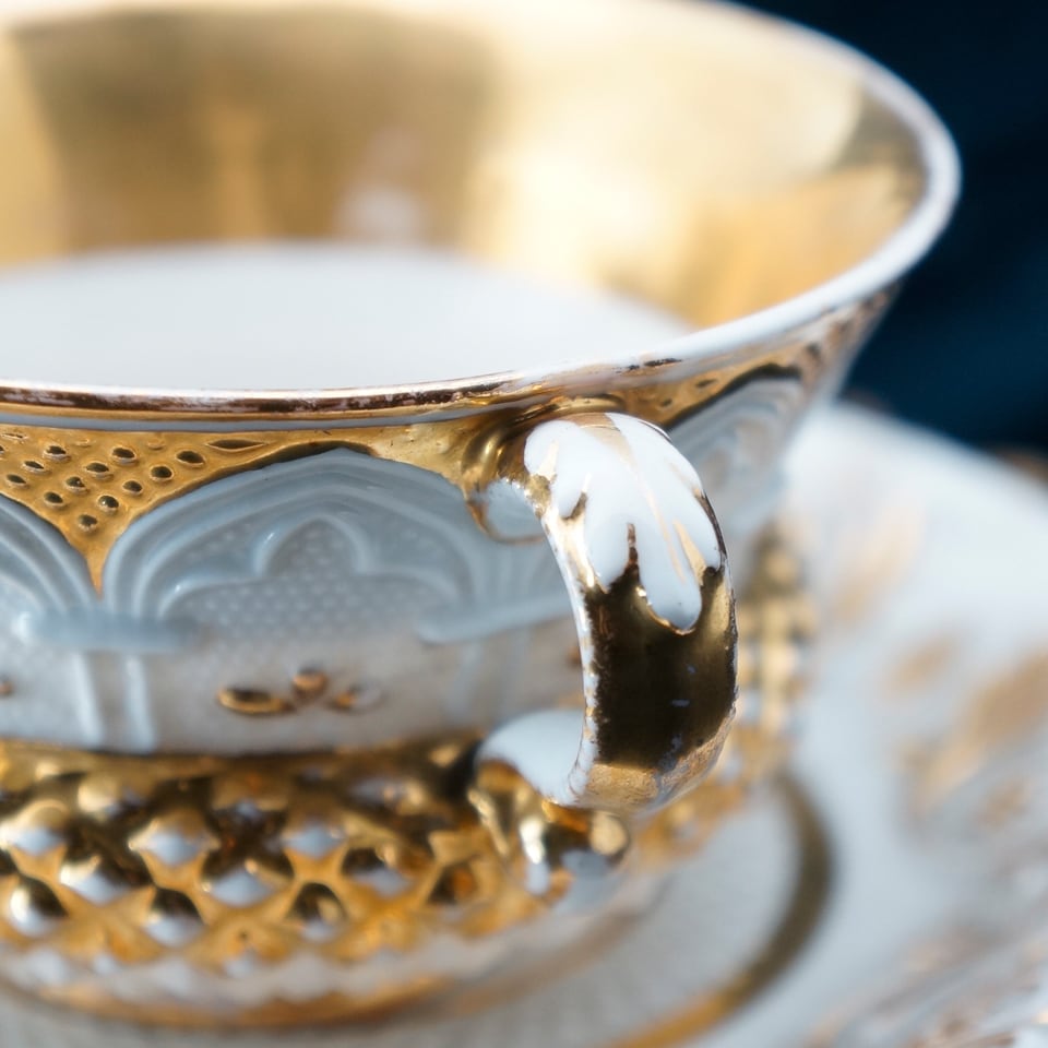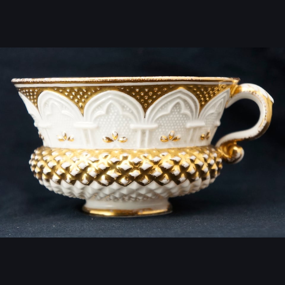 カップの側面はアーチに柱のような、建築的なデザインです。下部にふくらみをもたせ、四角錘の突起がびっしり。