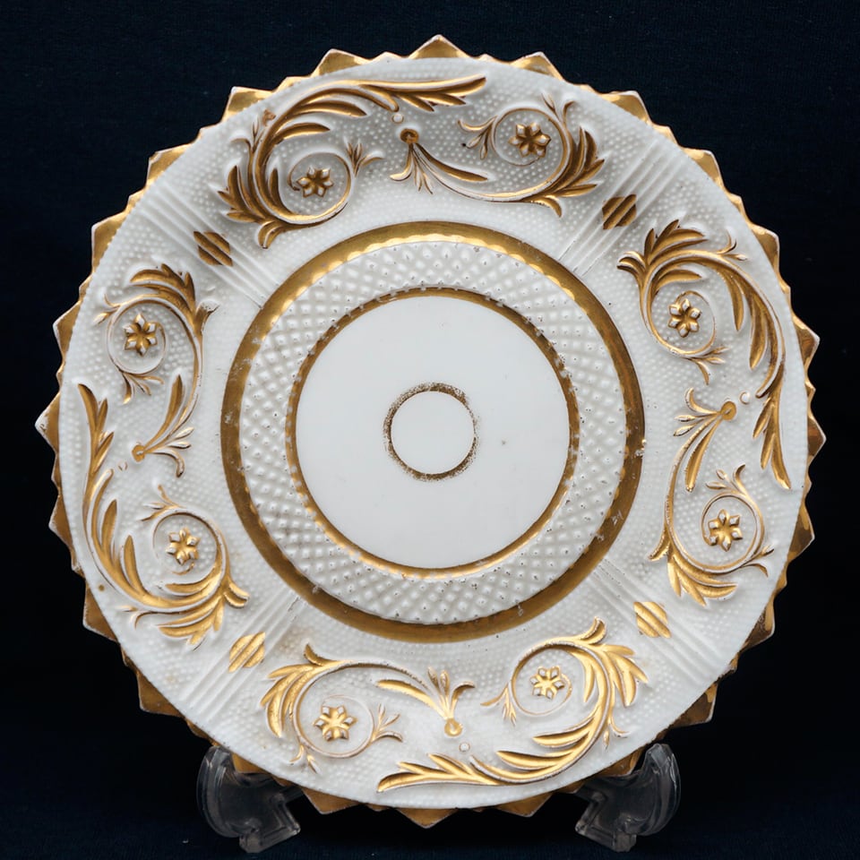 ソーサーの縁は小さな三角形を放射状に配置、きれいな曲線模様が4組配置されています。